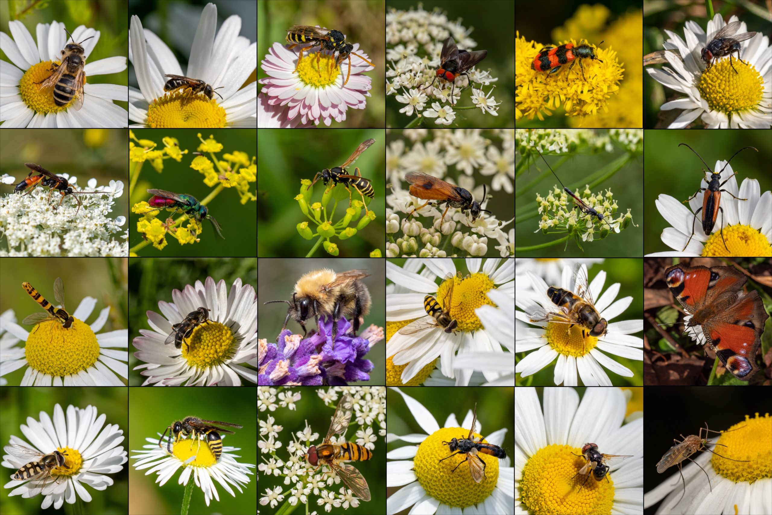 Kolaż przedstawia różnorodne owady zapylające – od pszczół samotnic przez inne błonkówki, muchówki i chrząszcze, aż po motyle – które sfotografowałem w okolicy starego sadu pod Miechowem. Różnią się wyglądem, trybem życia i wymaganiami siedliskowymi, ale razem tworzą lokalną sieć zależności, od której zależy pojawianie się owoców na naszych stołach.